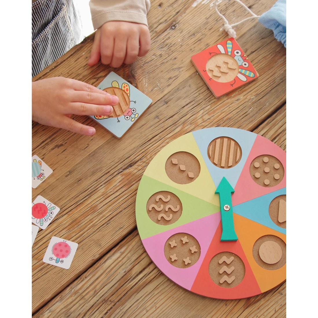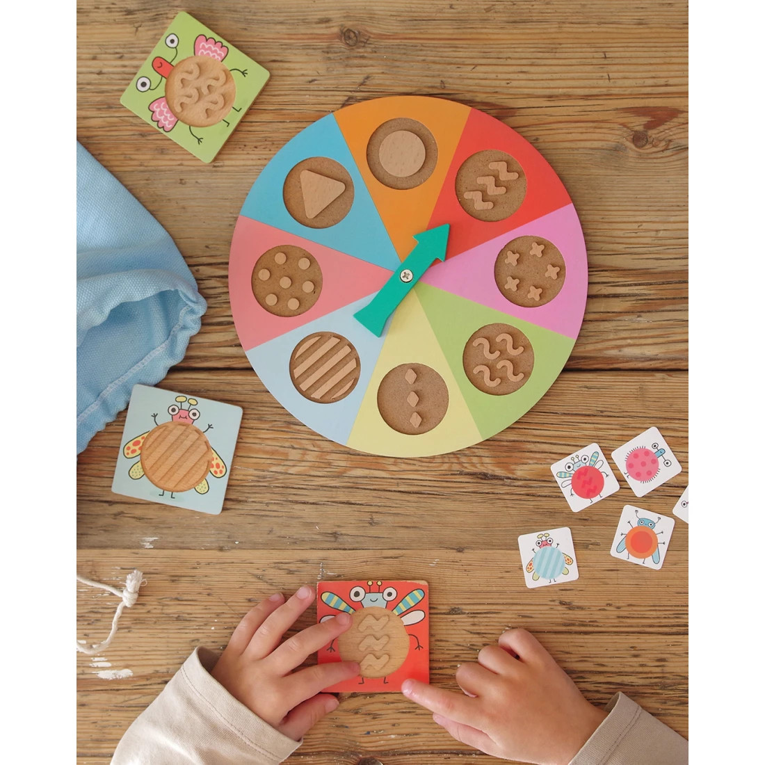 Dieťa najprv roztočí ruletku, ktorá určí vzor. Následne siahne do látkového vrecúška a pomocou hmatu sa pokúsi nájsť doštičku so zodpovedajúcim reliéfom – bez pozerania. Ak je výber správny, dieťa získa kartičku s ilustráciou hmyzu, ktorá má rovnaký vzor. Hra pokračuje ďalším kolom a víťazom sa stáva ten, kto ako prvý nazbiera štyri kartičky.
