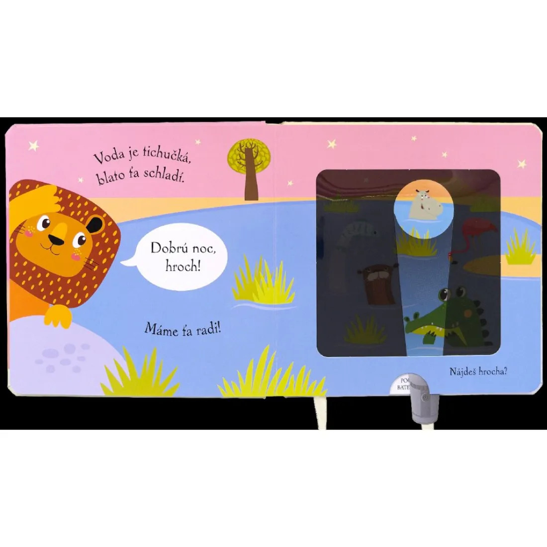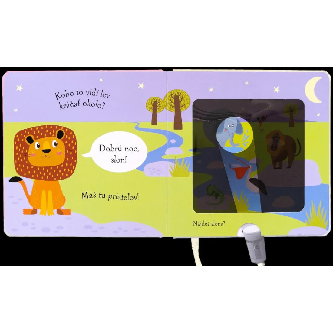Pomôž levíčaťu pomocou kúzelnej baterky nájsť všetkých zvieracích kamarátov, ukrytých v knižke. Čítanie vo veršoch, ideálne do postieľok. Vsuň čarovnú baterku medzi stránky a zisti, kto sa ukrýva v každej ilustrácii zobrazujúcej noc. Text vo veršoch učí deti vnímať prirodzený rytmus reči. Šikovne vyrobené okienka umožňujú deťom hľadať schované zvieratká pomocou priloženej kartónovej pomôcky v tvare svietidla. Ponúknite svojmu dieťaťu pred spaním nejakú upokojujúcu aktivitu. Táto knižka je na to priamo stvorená.