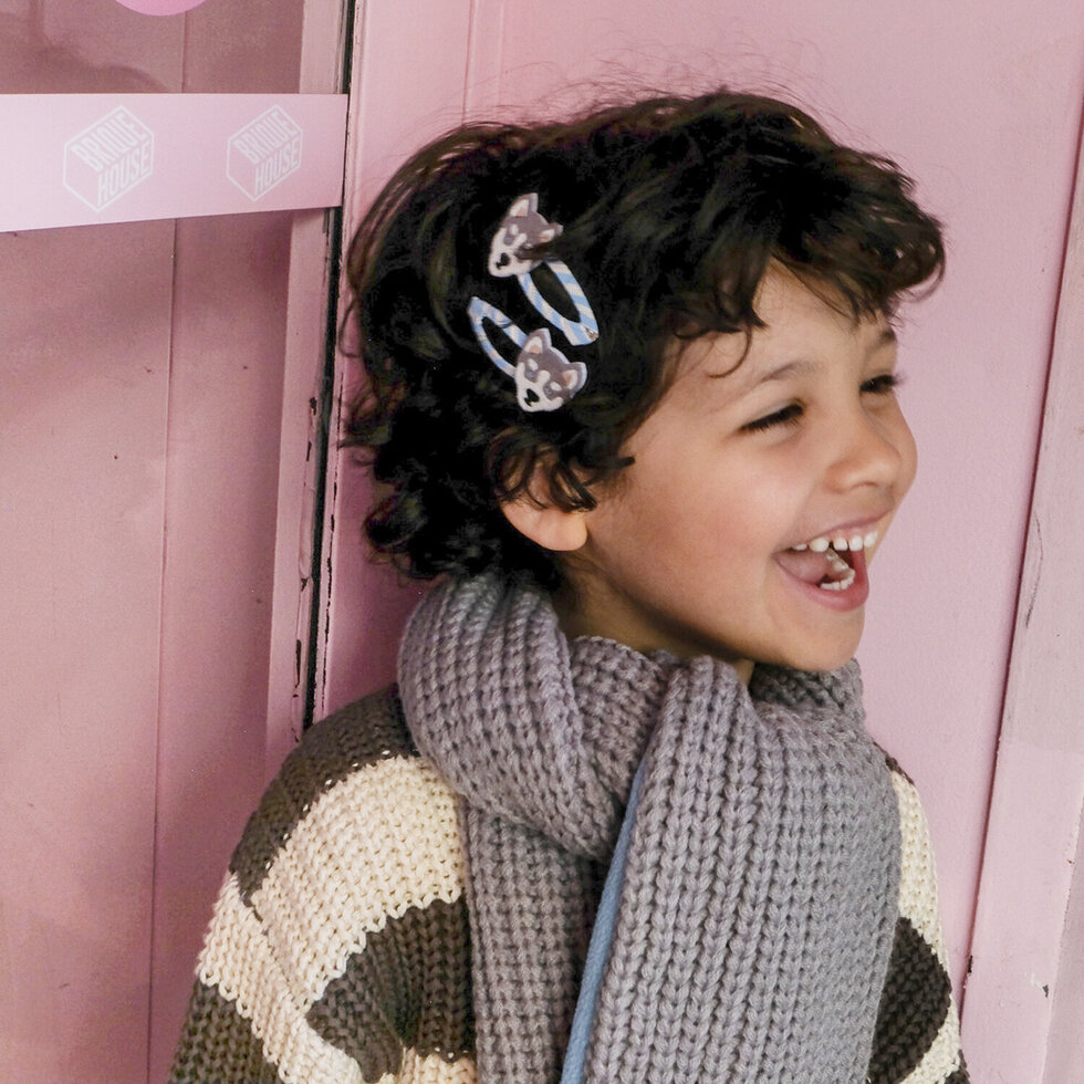 Náš verný snehový psík je perfektným parťákom na akékoľvek zimné dobrodružstvo! Dva nádherné sivé husky s jasne modrými očami, peknými ušami a trblietavým nosom sedia na modro-bielych patentných sponách omotaných pruhovanou stuhou. Sú také úžasné, že budete jačať od radosti! Vyrobené z recyklovaného filcu a trblietok.
